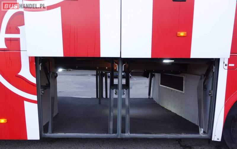 Wyposażenie: klimatyzacja, video, WC, lodówka, caffebar, kabina sypialna, oświetlenie indywidualne, nawiewy dyszowe, fotele odchylane, podnóżki, stoliczki, siateczki, ABS, ASR, tempomat, retarder, CD, mikrofon, fotele odchylane i rozsuwane, regulacja wysokości nadwozia, centralny zamek, podwójne szyby boczne, wspomaganie kierownicy, elektryczne lusterka, ogrzewanie stacjonarne, DVD