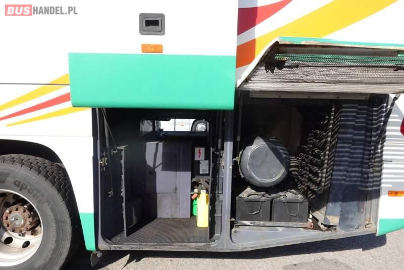 Wyposażenie: klimatyzacja, video, WC, lodówka, kabina sypialna, oświetlenie indywidualne, nawiewy dyszowe, fotele odchylane, podnóżki, stoliczki, siateczki, ABS, ASR, tempomat, retarder, CD, mikrofon, radio, fotele odchylane i rozsuwane, regulacja wysokości nadwozia, centralny zamek, podwójne szyby boczne, wspomaganie kierownicy, elektryczne lusterka, ogrzewanie stacjonarne, DVD, ESP